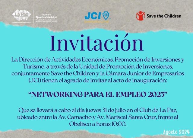 La Dirección de Actividades Económicas, Promoción de Inversiones y Turismo, a través de la Unidad de Promoción de Inversiones, conjuntamente Save the Children y la Cámara Junior de Empresarios (JCI) tienen el agrado de invitar al acto de inauguración: