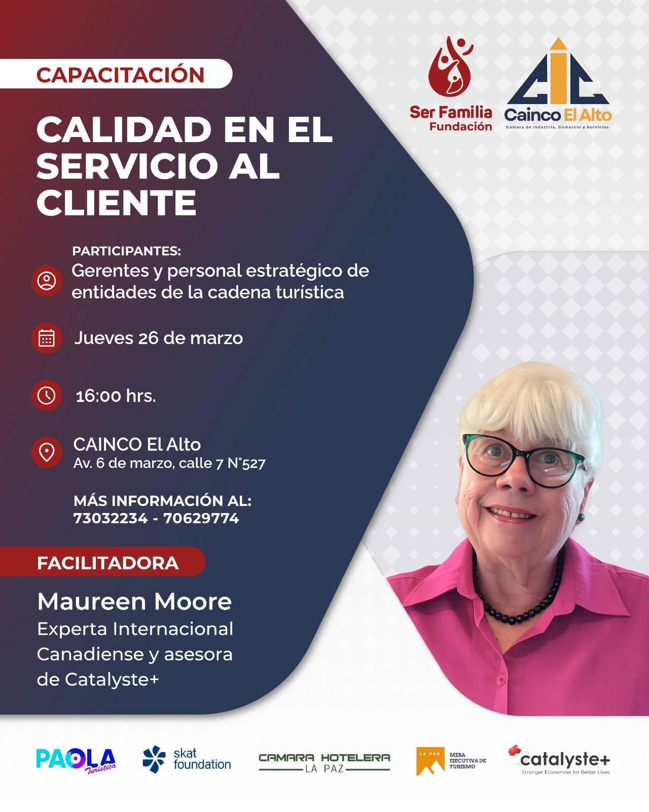 La sesión será facilitada por Maureen Moore, experta internacional canadiense y asesora en Catalyste+, quien compartirá herramientas prácticas para mejorar la experiencia del cliente y fortalecer los servicios turísticos.